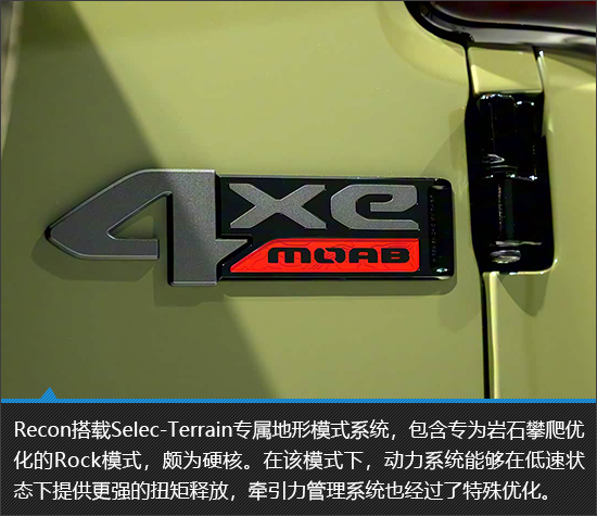 虽然很多人都不喜欢纯电动力系统,但是不得不承认,电动机确实能够为硬派越野车带来更多的可能性。基于出色的动力配置以及四驱系统,Jeep Recon通过了Trail Rated越野认证。作为Jeep品牌独有的越野能力认证体系,其主要考验车辆在非铺装路面和极端地形下的综合性能,以确保其能够在泥地、沙地、岩石等复杂地形中脱困。