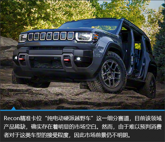 在新能源浪潮席卷汽车产业的时代背景下,硬派越野这一长期由燃油车型主导的细分市场,正在迎来电动化转型的关键节点。作为承载全球无数消费者越野情怀的标杆品牌,Jeep并未在市场变革中迷失方向,尽管其电动化转型的节奏相对比较缓慢,但是凭借深厚的品牌底蕴以及技术积淀,简单“露一手”就尽显功力。不久前,Jeep Recon的车型官图正式发布,其不仅传承了Jeep品牌80余年的硬核越野基因,更依托前沿电动化技术,为硬派越野车的未来开创了多元化路径。